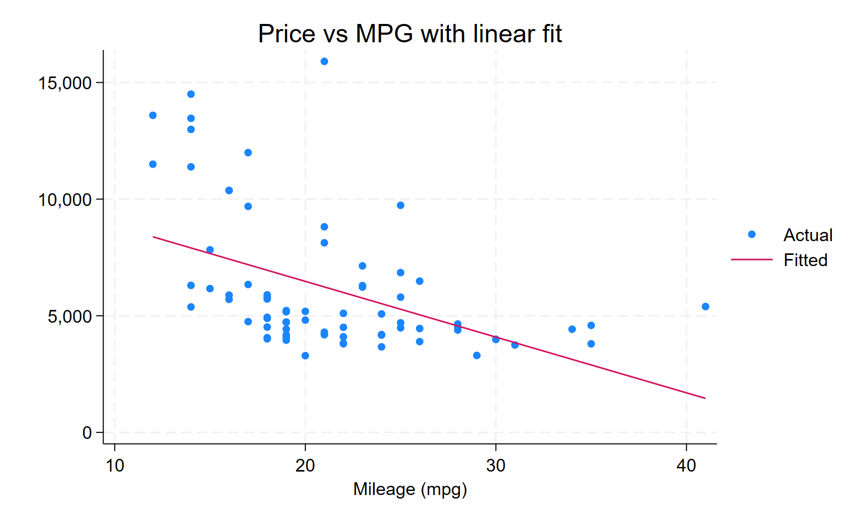 title("Price vs MPG with linear fit") legend(order(1 "Actual" 2 "Fitted"))